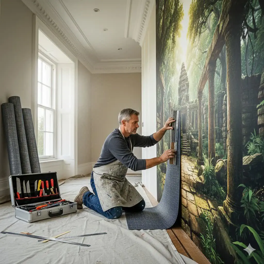 روش نصب: چسب مخصوص روی دیوار یا پشت پوستر اعمال میشود، سپس با ابزار صافکننده و کاردک نصب میشود